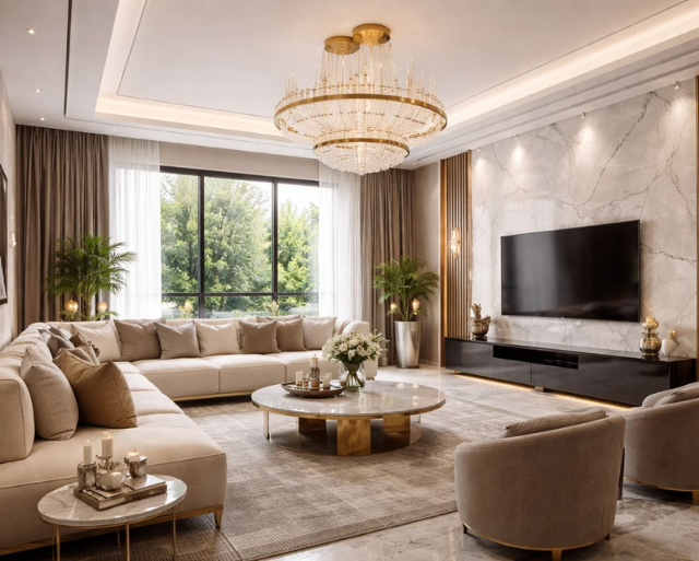 We handle complete interior work including furniture, panels, lighting, painting, and installation.